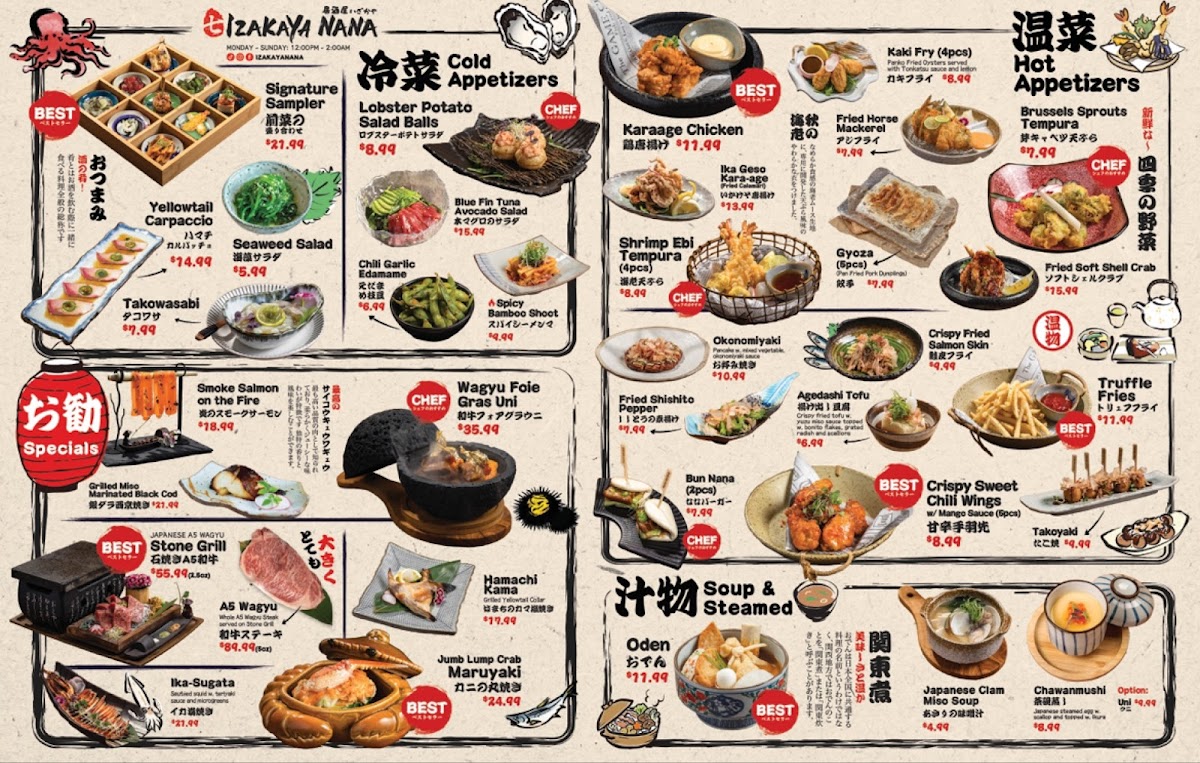 If you're in the mood for a casual yet satisfying dining experience, the Izakaya Nana Menu offers a delightful array of Japanese-inspired dishes perfect for sharing with friends or enjoying solo. Nestled on Northern Boulevard in Flushing, NY, this cozy spot is known for its wide selection of small plates, each bursting with flavor. From crispy tempura to savory yakitori, there’s something to please every palate. The menu also features a variety of rice bowls, fresh sashimi, and hearty soups, making it easy to mix and match to suit your cravings. Whether you’re stopping by for a quick bite or a leisurely meal, Izakaya Nana brings authentic Japanese comfort food right to your table.